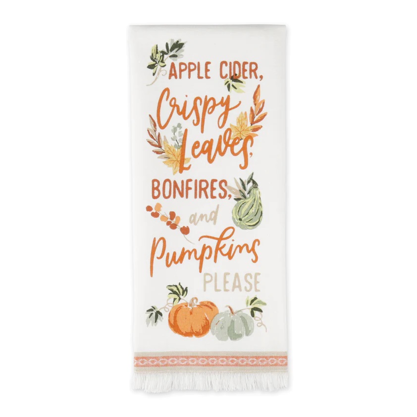 Apple cider, Crispy Leaves, bonfires and Pumpkins Please. This beautifully-decorated cotton towel will add gorgeous color and pattern to your kitchen. Also makes a great gift.